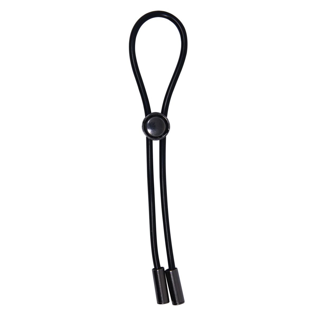 Черное эрекционное лассо. Благодаря регулировке подходит для члена любого размера. Может затягиваться вокруг мошонки.