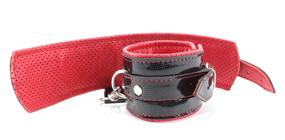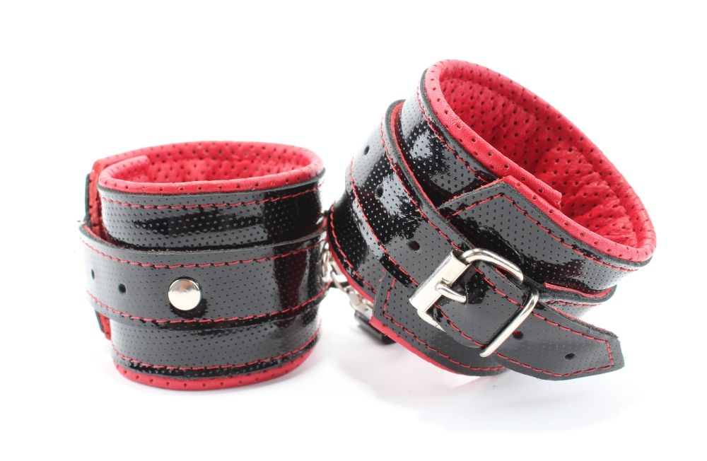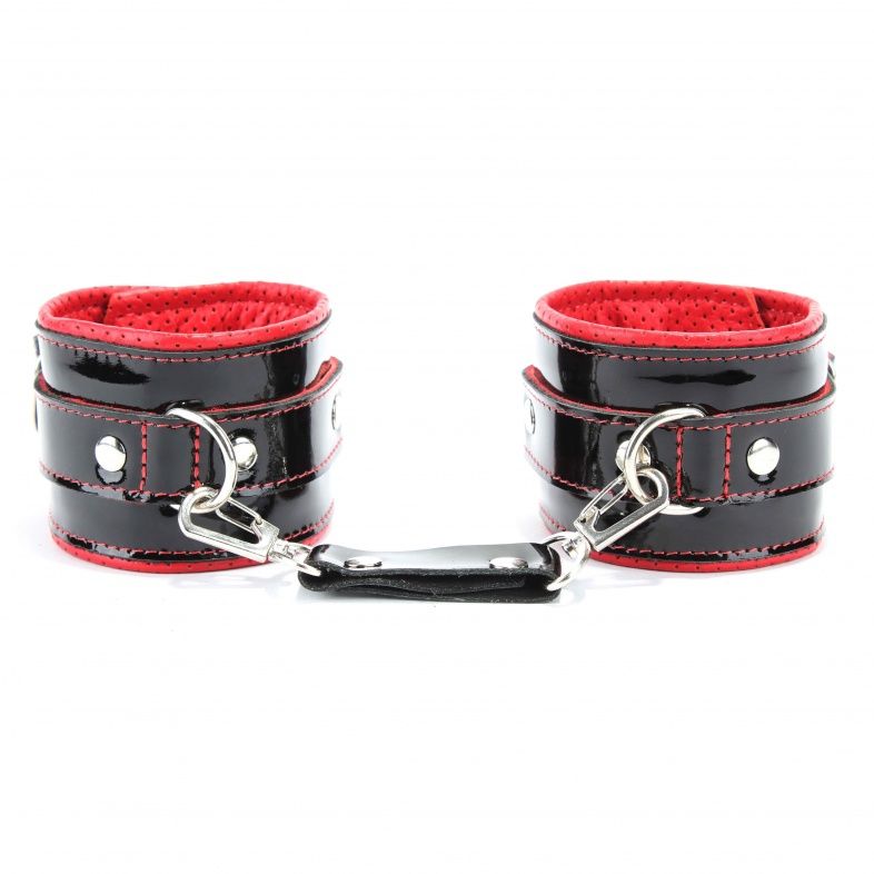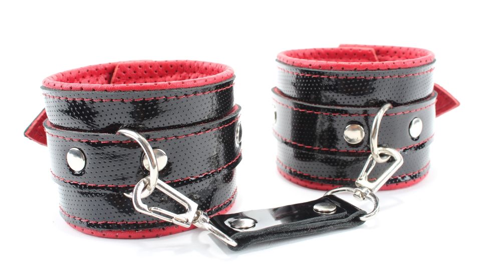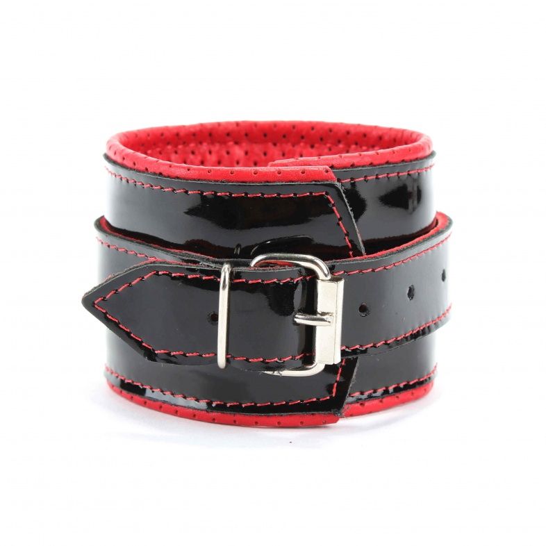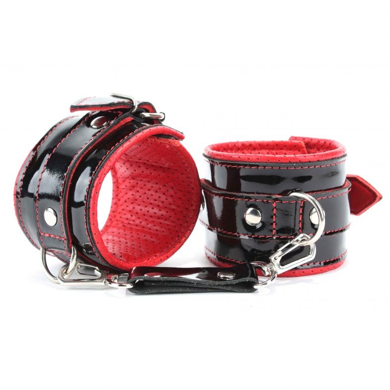 Наручники из натуральной кожи лак черные с интересным узором, подклад мягкая перфорированная кожа. Сварная металлическая фурнитура и цельный хлястик для надежной фиксации. Не нарушают кровообращение, надёжно фиксируются на запястьях с помощью ремешков. Размер универсальный, регулируемый. Ширина - 6 см.