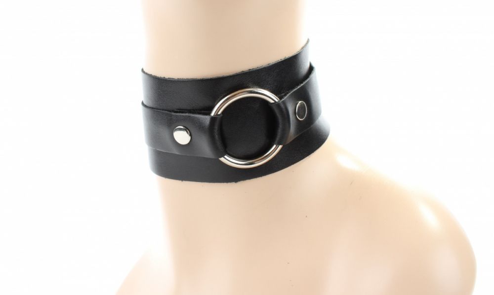 Чокер сделан из мягкой натуральной. Впереди высокая стойка декорирована металлическим кольцом, размер чокера регулируется пряжкой сзади. Дизайн аксессуара позволяет носить его двумя сторонами, внося разнообразие в выбранный образ.