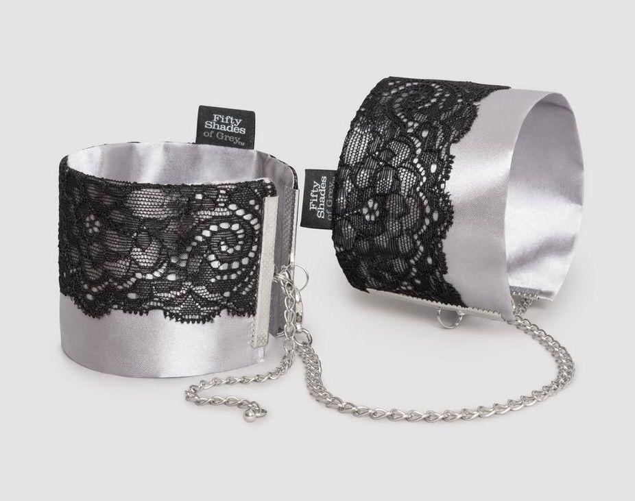 В честь десятилетия эротических открытий и достижений официальная коллекция «Пятьдесят оттенков серого» приглашает вас погрузиться в атмосферу роскоши и удовольствий. Коллекция стильных высококачественных игрушек, аксессуаров для бондажа и предметов первой необходимости, созданная Э.Л. Джеймс, объединяет в себе все, что может вам понадобится, чтобы исследовать свои чувства и впечатления в спальне и за ее пределами. Переливающиеся серебристые манжеты-наручники с нежной черной кружевной отделкой. Комфортно ощущаются даже на самой нежной коже. Деликатно, но надежно удерживают руки. Обеспечивает высокий комфорт при длительном ношении.